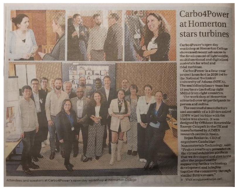 We co-organized the Carbo4Power wind power event at Homerton College, Cambridge, in October 2024. Through strategic dissemination efforts, we secured coverage in the reputable Cambridge Independent newspaper, highlighting the event’s impact and advancing awareness of innovative wind power technologies.